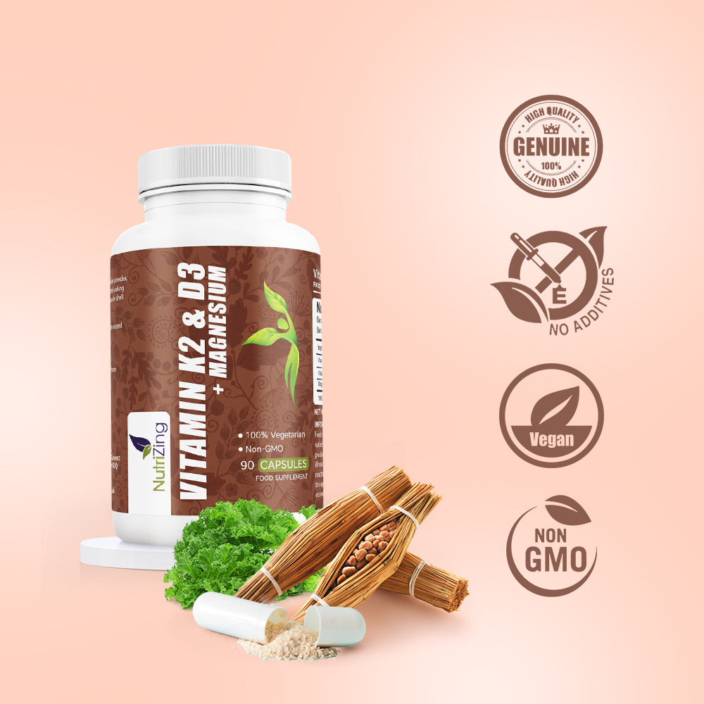 The powerhouse combination of Vitamin K2, D3, and Magnesium offers a myriad of health benefits crucial for overall well-being. Vitamin D3 supports immune system function. Along with K2, it plays a pivotal role in calcium absorption, aiding in the maintenance of strong bones and teeth and thereby reducing the risk of osteoporosis. Magnesium plays a role in maintaining a healthy heart rhythm and may help lower blood pressure.